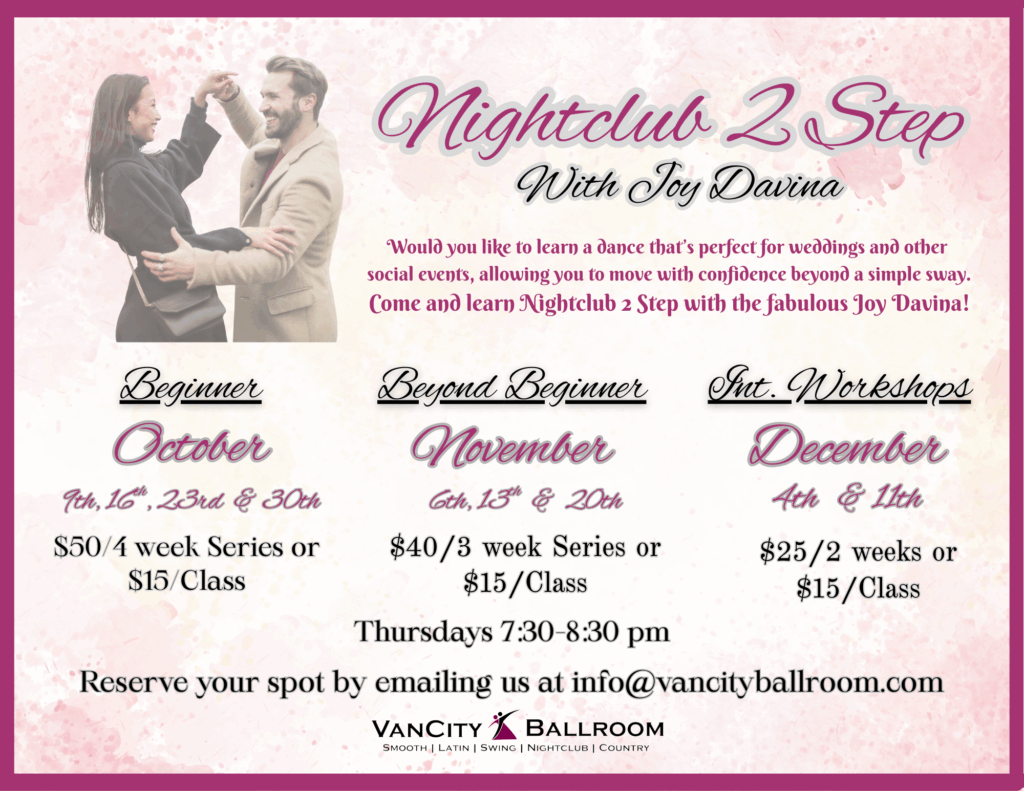 Whether you love swing, waltz, two step or salsa, VanCity offers a variety of music styles for you to enjoy. Join us at Vancouver Fitness Studio on Saturdays for a night of dancing, music, friends and fun!