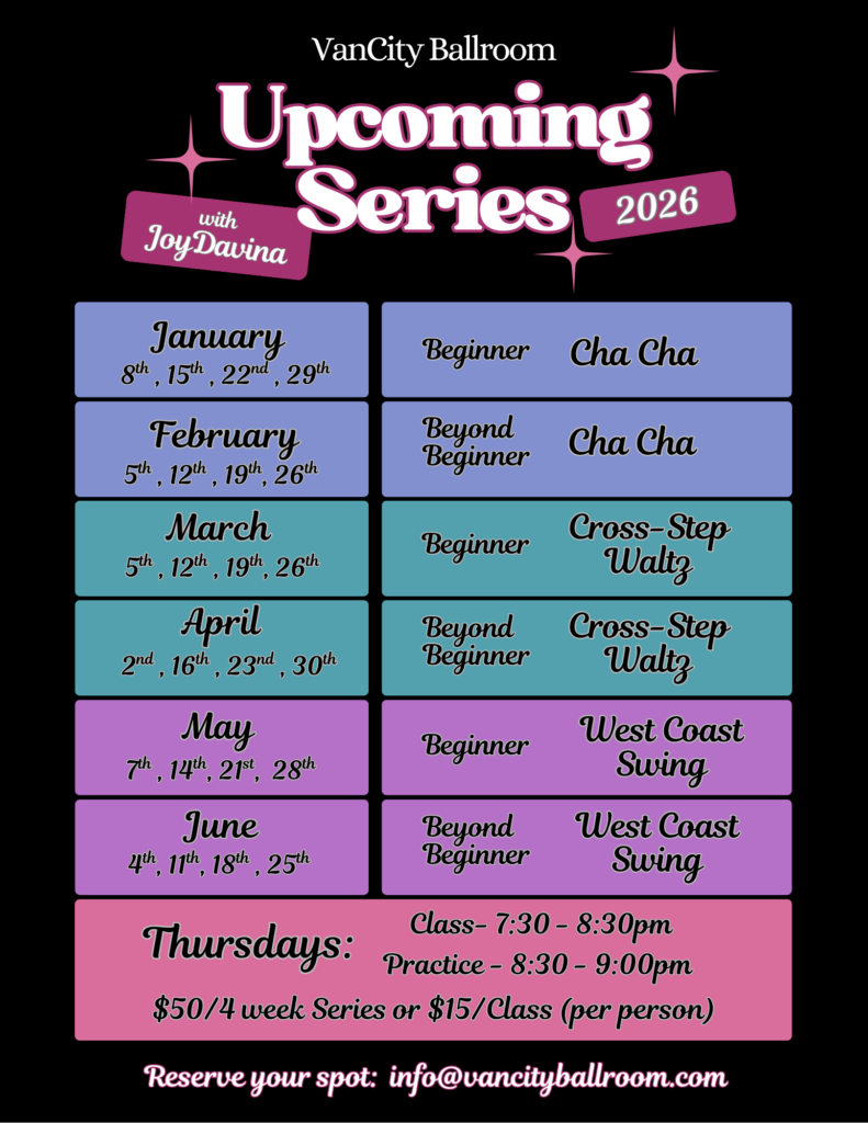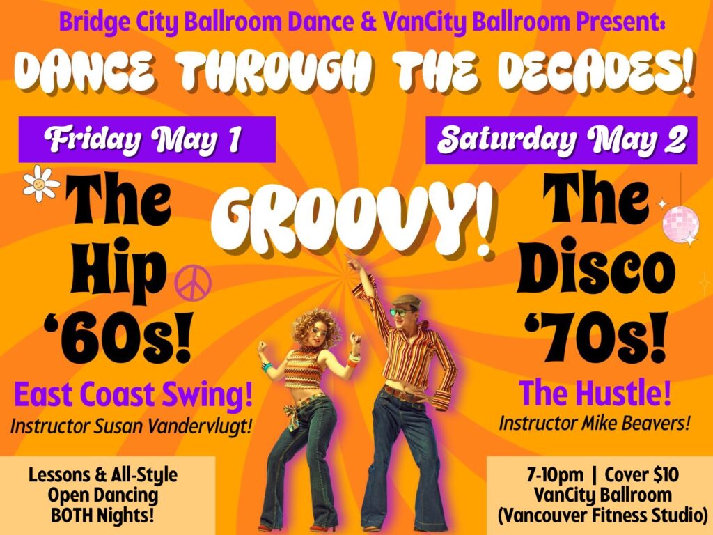 Whether you love swing, waltz, two step or salsa, VanCity offers a variety of music styles for you to enjoy. Join us at Vancouver Fitness Studioon Saturdays for a night of dancing, music, friends and fun!